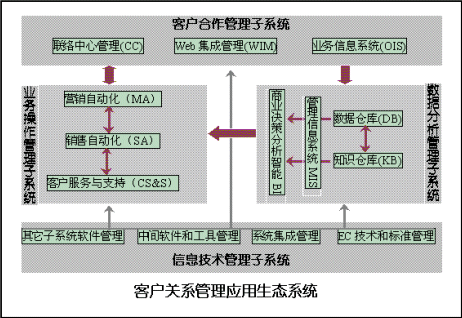 由上述四個子系統(tǒng)組成的客戶關(guān)系管理的生態(tài)系統(tǒng),基本的結(jié)構(gòu)和體系可如下圖所示: