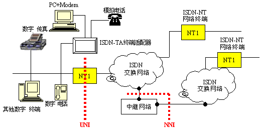 ISDN概念中的業(yè)務綜合的核心是從用戶端出發(fā),建立了一套標準的用戶和網(wǎng)絡接口協(xié)議體系(UNI:User-Network Interface)。同時給出了各ISDN網(wǎng)絡間互聯(lián)的NNI接口。這樣,非常簡單的統(tǒng)一了開發(fā)標準,提供了一個廠商間開放的競爭環(huán)境。見下圖。