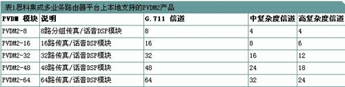 在任意思科集成多業(yè)務(wù)路由器平臺(tái)主板上使用任意思科PVDM2產(chǎn)品(PVDM2-8,PVDM2-16,PVDM2-24,PVDM2-32或PVDM2-64),可實(shí)現(xiàn)內(nèi)嵌模塊性,無需使用網(wǎng)絡(luò)模塊或AIM,即可提供會(huì)議、譯碼和話音端接。在思科集成多業(yè)務(wù)路由器中安裝思科PVDM2產(chǎn)品,可為IP話音流量和時(shí)分多路復(fù)用(TDM)流量提供這些服務(wù)。使用思科集成多業(yè)務(wù)路由器上本地安裝的VIC、VWIC或EVM(EVM僅在Cisco