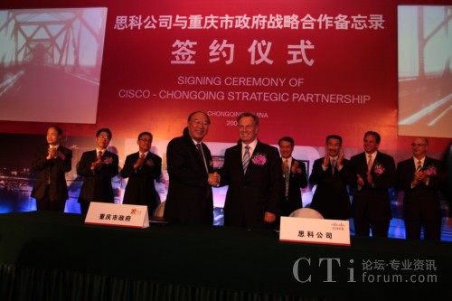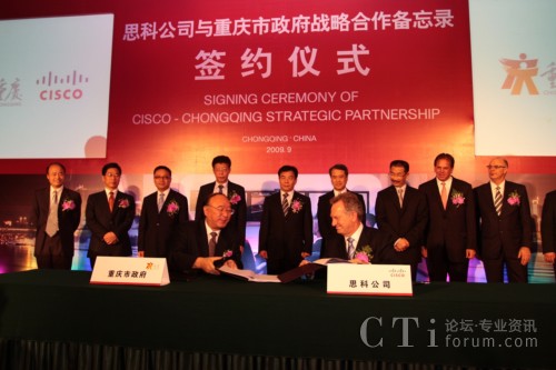 CTI論壇(ctiforum)9月14日消息:2009年9月11日,重慶市人民政府與思科正式簽訂合作備忘錄,雙方將結(jié)為戰(zhàn)略合作伙伴關(guān)系,就通信產(chǎn)品制造、“智能+互聯(lián)城市”試點示范、綠色技術(shù)研發(fā)與創(chuàng)新及風險投資等多方面展開深入合作。此次合作將進一步加快重慶市產(chǎn)業(yè)結(jié)構(gòu)和產(chǎn)品結(jié)構(gòu)調(diào)整,促進內(nèi)陸開放城市建設(shè);加快發(fā)展重慶通信產(chǎn)品產(chǎn)業(yè)集群,把重慶建設(shè)成為西部重要的現(xiàn)代通信產(chǎn)品制造基地;推動以信息產(chǎn)業(yè)為主體的重慶高新技術(shù)產(chǎn)業(yè)發(fā)展以及本土創(chuàng)新和可持續(xù)性能力的提供,更高效便捷地加快本土企業(yè)的國際化進程;整合多方國際資源,以推進重慶在中國率先成為“智能+互聯(lián)城市”,讓市民享受更多的工作和生活便利及實惠。作為思科在華創(chuàng)新及可持續(xù)發(fā)展戰(zhàn)略實施的又一里程碑,此次合作不僅是思科“智能+互聯(lián)城市”計劃在中國與當?shù)卣氖锥群献黜椖,也是思科在“協(xié)作型創(chuàng)新模式”指導下激勵本土創(chuàng)新的全新實踐。