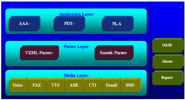 SSurnon-IVR系統(tǒng)分為支撐系統(tǒng)和應(yīng)用服務(wù)器兩大部分,支撐系統(tǒng)的核心為Browser Layer。由它來解釋和執(zhí)行流程的業(yè)務(wù)邏輯,由Media Layer提供具體的操作,主要是管理語音、傳真、IP等資源,對Browser Layer屏蔽掉硬件的區(qū)別,提供統(tǒng)一的接口,以插件的形式提供各種功能。在它們之外還有配置管理、維護監(jiān)控、告警管理、統(tǒng)計報表等。應(yīng)用服務(wù)器部分包括外呼管理、數(shù)據(jù)庫中間件,傳真網(wǎng)關(guān)、自然語音理解引擎等。具體的結(jié)構(gòu)見下圖: