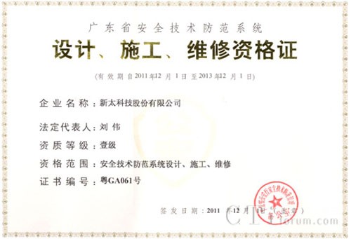 CTI論壇(ctiforum)12月21日消息(記者 張潔):2011年12月,新太科技再傳喜訊,公司順利通過廣東省公安廳認定的“廣東省安全技術防范系統(tǒng)設計、施工、維修一級資格證”換證審核,成功獲得新證書。