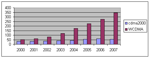 2000年,3G市場(chǎng)收入在cdma2000(大約31億美元,占38%)與WCDMA(大約50億美元,占62%)分布為1/3比2/3。我們不難看出,這種變化有利于WCDMA。到2007年,預(yù)計(jì)WCDMA將占全部市場(chǎng)收入的86%。這是由于對(duì)于WCDMA,運(yùn)營(yíng)商需要增加支出來將其網(wǎng)絡(luò)升級(jí)為GPRS、EDGE與WCDMA。同時(shí),在預(yù)測(cè)期內(nèi),TDMA運(yùn)營(yíng)商最終要將其所有現(xiàn)存的TDMA與模擬特性升級(jí)為GSM/GPRS。相比之下,CDMA運(yùn)營(yíng)商處于良好的狀態(tài),其現(xiàn)有基礎(chǔ)設(shè)施的大部分軟件已經(jīng)升級(jí)。CDMA運(yùn)營(yíng)商,如Verizon,確實(shí)也有模擬特性,但是較之GSM/TDMA而言,它們要低得多。CDMA運(yùn)營(yíng)商支出的大部分將以新的Cell sites的形式出現(xiàn)的覆蓋率。