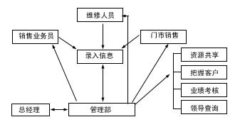 根據(jù)英普的業(yè)務(wù)管理模式,公司將門市銷售、維修部、大客戶部的業(yè)務(wù)管理工作,交由管理部全部管理和協(xié)調(diào),這三個部門將各自與客戶接待、交往過程、工作計劃全部明細(xì)記錄,交由管理部確認(rèn),管理部在保證必要保密的情況下,進(jìn)行工作再分配,同時加強(qiáng)業(yè)務(wù)考核和其他管理職能工作。其業(yè)務(wù)流程如圖1。