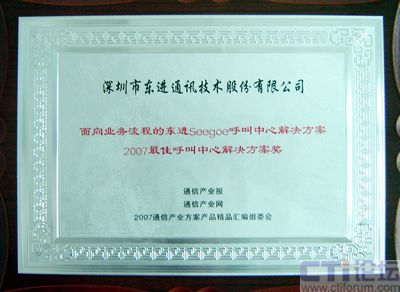 10月23日,中國國際通信設(shè)備技術(shù)展覽會國際通信展覽會開幕當(dāng)天,由通訊產(chǎn)業(yè)報(bào)社主辦的2007通信產(chǎn)業(yè)方案產(chǎn)品精品評選活動(dòng)頒獎(jiǎng)典禮隆重舉行,東進(jìn)技術(shù)的“面向業(yè)務(wù)流程的東進(jìn)Seegoe呼叫中心解決方案”榮獲2007最佳呼叫中心解決方案獎(jiǎng)。
