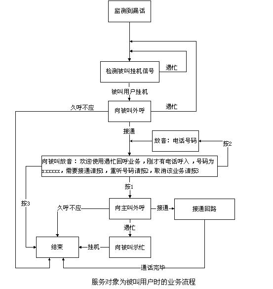 當服務(wù)對象是被叫用戶時,產(chǎn)生遇忙漏話后,東進漏話監(jiān)測設(shè)備(DMCS)實時檢測被叫用戶的掛機信號,如果被叫掛機,則先向被叫外呼,呼出接通后,語音提示“歡迎使用遇忙回呼業(yè)務(wù),剛才有電話呼入,號碼為xxxxxx,需要接通請按1,重聽號碼請按2,取消該業(yè)務(wù)請按3”,如按1,系統(tǒng)向原主叫外呼(亦稱回呼),回呼成功(ACM)后,建立話音回路,進一步接續(xù);如回呼原主叫時遇忙(SLB、STB等),則回呼失敗,向被叫用戶示忙。
