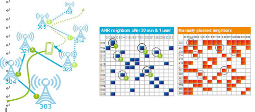 ANR盡管目前在LTE還沒(méi)有商用,但在多個(gè)歐美運(yùn)營(yíng)商的測(cè)試中,愛(ài)立信產(chǎn)品表現(xiàn)良好。如下圖ANR測(cè)試中,僅使用一個(gè)移動(dòng)終端在20分鐘內(nèi)通過(guò)了20個(gè)基站覆蓋區(qū)域,檢測(cè)到的鄰區(qū)關(guān)系如藍(lán)圖所示,相比橙色圖的手工配置鄰區(qū),所有必要的鄰區(qū)關(guān)系(有數(shù)字標(biāo)示)悉數(shù)獲得。而且這僅僅動(dòng)用了一個(gè)終端,如果相關(guān)區(qū)域內(nèi)都有終端分布,檢測(cè)的速度會(huì)有極大提高。