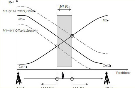 過(guò)早、過(guò)晚切換是由于目標(biāo)小區(qū)切換門(mén)限過(guò)低和過(guò)高所致。對(duì)應(yīng)過(guò)早和過(guò)晚臨界切換門(mén)限之間的區(qū)間就是合理的移動(dòng)性?xún)?yōu)化范圍。頻內(nèi)的負(fù)載均衡也可以通過(guò)調(diào)整切換門(mén)限值來(lái)引導(dǎo)用戶和負(fù)荷由高負(fù)荷小區(qū)遷移至低負(fù)荷小區(qū),很顯然可調(diào)的門(mén)限區(qū)間就是移動(dòng)性?xún)?yōu)化允許的范圍。這個(gè)范圍對(duì)應(yīng)相鄰小區(qū)的重覆蓋面積,在LTE中理論上大概相當(dāng)于正常小區(qū)面積的15%,可操作的價(jià)值不是很大。愛(ài)立信更傾向于異頻或者異系統(tǒng)的負(fù)荷均衡方案,增益比較明顯。如下圖,一個(gè)終端從左至右移動(dòng),M1、M2分別是接收到eNB1和eNB2的信號(hào)強(qiáng)度曲線,兩條曲線相交點(diǎn)對(duì)應(yīng)的地理位置處終端接收到的信號(hào)強(qiáng)度相同,對(duì)cell1到cell2的切換,下面的虛線對(duì)應(yīng)過(guò)早切換臨界,上面的虛線對(duì)應(yīng)過(guò)晚切換臨界,兩線與M2相交點(diǎn)對(duì)應(yīng)合理切換門(mén)限區(qū)間,也是頻內(nèi)負(fù)載均衡MLB的可調(diào)范圍。