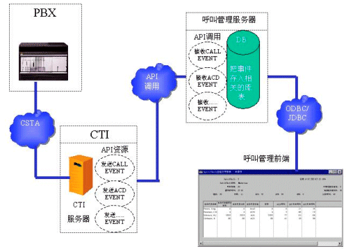 這是最常見(jiàn)的一種模式,呼叫管理服務(wù)器通過(guò)CTI SERVER提供的API來(lái)獲取PBX傳來(lái)的各種消息,具體消息的種類(lèi)和格式由CTI SERVER的功能來(lái)決定。呼叫管理服務(wù)器把獲取的各種信息進(jìn)行分析和處理,匯總到統(tǒng)一的數(shù)據(jù)庫(kù)中。最后通過(guò)呼叫管理前端程序?qū)?shù)據(jù)庫(kù)進(jìn)行查詢(xún),顯示出呼叫中心內(nèi)部的各種信息。其數(shù)據(jù)流程如下圖所示: