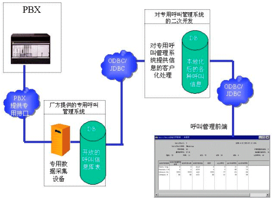 一般來(lái)說(shuō),各大有能力推出PBX產(chǎn)品的通訊廠商都有自己專(zhuān)用的呼叫管理系統(tǒng)。這些專(zhuān)用的呼叫管理系統(tǒng)可以直接從PBX獲取最高效的消息,而不用通過(guò)CTI SERVER。當(dāng)然,這些專(zhuān)用的呼叫管理系統(tǒng)也只能應(yīng)用于專(zhuān)門(mén)的PBX產(chǎn)品。 如果運(yùn)營(yíng)商在選購(gòu)設(shè)備的時(shí)候,已經(jīng)選購(gòu)了專(zhuān)用的呼叫管理系統(tǒng),那么開(kāi)發(fā)商可以對(duì)這個(gè)專(zhuān)門(mén)的呼叫管理系統(tǒng)進(jìn)行二次開(kāi)發(fā)。請(qǐng)看下面的數(shù)據(jù)流程圖: