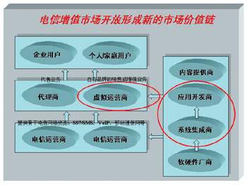 在電信增值市場開放的背景之下,新的市場價值鏈正在形成(如圖所示)。國內(nèi)電信建設(shè)轟轟烈烈的大規(guī);A(chǔ)設(shè)施投資已是明日黃花,改善應(yīng)用“稀缺”的現(xiàn)狀才是當(dāng)務(wù)之急。李峻認(rèn)為,信息產(chǎn)品技術(shù)服務(wù)提供商最主要的任務(wù),就是幫助運營商開發(fā)針對中國市場的增值業(yè)務(wù),并帶動其主業(yè)協(xié)同發(fā)展。即面向電信網(wǎng)絡(luò)運營商以及虛擬運營商,提供增值業(yè)務(wù)系統(tǒng)整體解決方案及其軟硬件支撐平臺和應(yīng)用系統(tǒng)。