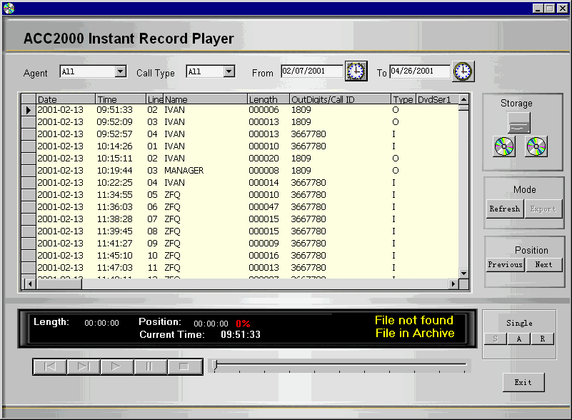 ACC2000 多媒體溝通中心采用最先進(jìn)的海量存儲設(shè)備DVD RAM構(gòu)建實時多通道語音錄制、備份系統(tǒng)��ACC2000 DVD Record Backup。這個系統(tǒng)可以根據(jù)管理員設(shè)定的錄音對象,對符合錄音條件的通話自動進(jìn)行錄音。