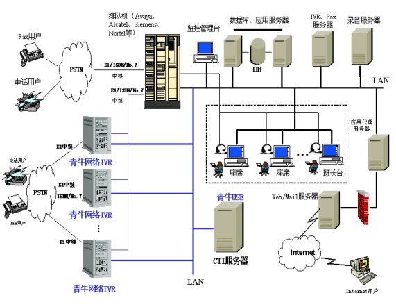 集群的青牛ATS(網(wǎng)絡IVR)節(jié)點根據(jù)系統(tǒng)規(guī)?膳渲孟鄳臄(shù)字語音處理卡,它不但可以實現(xiàn)交互式語音應答IVR、外撥Outbound、傳真Fax等自動語音服務,而且可實現(xiàn)交換、ACD、路由點等功能,每個青牛ATS節(jié)點不但提供IVR自動語音應答的所有自動語音功能,還提供CSTA Phase II的接口實現(xiàn)與USE(CTI中間件)的CTI 鏈路功能,青牛USE通過該接口實現(xiàn)對呼叫的控制與路由。青牛ATS節(jié)點猶如一個具有ACD功能的PBX,而且具有自動語音IVR所有功能。