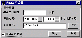自動備份由事先設(shè)定的磁盤空間報警閾值觸發(fā),它會發(fā)出信息提示或聲音提示,然后將用戶事先確定的時間范圍內(nèi)的錄音文件全部備份到客戶機(jī)硬盤、磁盤陣列或其他記錄介質(zhì)上,并且可以自動刪除系統(tǒng)硬盤上已經(jīng)被備份出來的文件。