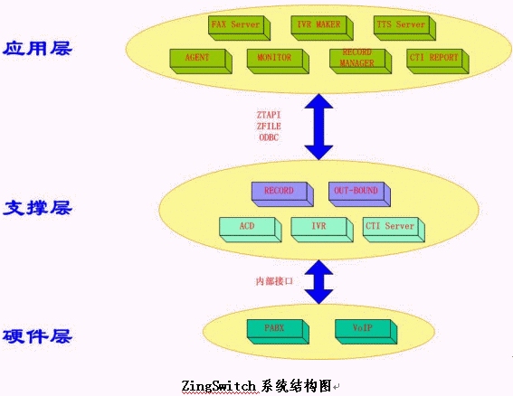 在以上三層結(jié)構(gòu)中,前兩層與具體業(yè)務(wù)系統(tǒng)無(wú)關(guān)。上層業(yè)務(wù)系統(tǒng)的多種變化,不會(huì)影響下層的穩(wěn)定;而下層規(guī)范地進(jìn)行優(yōu)化和擴(kuò)展后,上層的所有應(yīng)用都可在業(yè)務(wù)功能上得到擴(kuò)展。這樣,用戶(hù)的業(yè)務(wù)應(yīng)用系統(tǒng)自身可以有多種功能和性能的變動(dòng)和擴(kuò)展,同時(shí),當(dāng)基于ZingSwitch一體化交換機(jī)的呼叫中心系統(tǒng)平臺(tái)在進(jìn)行擴(kuò)容、升級(jí)的時(shí)候,原來(lái)已經(jīng)無(wú)縫掛接其上的用戶(hù)的業(yè)務(wù)應(yīng)用系統(tǒng)也無(wú)需任何更改即可運(yùn)行。