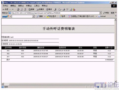 2.項(xiàng)目組外撥分析:包括手動外呼話費(fèi)明細(xì)表、手動外呼話費(fèi)總計(jì)表、項(xiàng)目組手動外呼日報告、項(xiàng)目組自動外呼日報告、項(xiàng)目組座席外撥總計(jì)、自動外呼話費(fèi)明細(xì)表、自動外呼話費(fèi)總計(jì)表、座席外呼日報告等。該統(tǒng)計(jì)報表分別提供了針對手動和自動的外撥話務(wù)、話費(fèi)統(tǒng)計(jì),分類明確,統(tǒng)計(jì)方便。