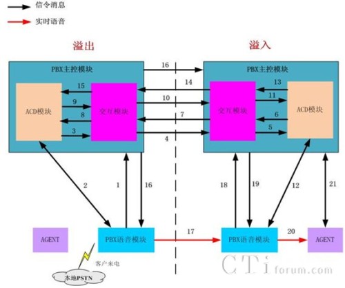 通過PBX/ACD建立一種電話路由共享和語音溢出的方法,實(shí)現(xiàn)多套聯(lián)絡(luò)中心平臺之間語音的動態(tài)互溢,透明地為客戶提供優(yōu)質(zhì)、及時的電話服務(wù),客戶感覺不到任何差異。通過PBX/ACD建立一種電話路由共享和語音溢出的方法,作為行業(yè)現(xiàn)有實(shí)現(xiàn)方法的有效補(bǔ)充,解決了行業(yè)現(xiàn)有實(shí)現(xiàn)方法的無法實(shí)現(xiàn)最短路徑溢出問題,通過ACD的“先排隊(duì)后進(jìn)門”的預(yù)約預(yù)定模式,動態(tài)判斷彼此的運(yùn)行狀態(tài)和處理能力,無需先將語音溢出到另外一個聯(lián)絡(luò)中心,只有當(dāng)另外一個聯(lián)絡(luò)中心確定能提供相應(yīng)的語音服務(wù)和人工服務(wù)的時候,語音才在PBX語音層面通過標(biāo)準(zhǔn)通信協(xié)議進(jìn)行互聯(lián)互通,避免實(shí)時語音被多次溢出,實(shí)時實(shí)時語音溢出只走最短路徑,保證客戶電話只需一次溢出就能立即提供語音服務(wù)和人工服務(wù),大幅減少了語音溢出的處理時間,同時也大幅減少了語音處理次數(shù),提升了系統(tǒng)處理性能。