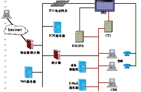 AllCom ICC呼叫中心采用開放的和可擴(kuò)展的體系結(jié)構(gòu),通過高度靈活的系統(tǒng)平臺(tái),為客戶提供Internet多媒體的接入方式。圖中右側(cè)是傳統(tǒng)呼叫中心部分,左側(cè)為Internet呼叫中心所特有的,其中關(guān)鍵部件為Internet呼叫管理(ICM)和IP電話網(wǎng)關(guān)(ITG)。