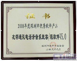 2009年1月,友鄰?fù)ㄓ嶋娫掍浺粝到y(tǒng)客/服軟件V5.0 榮獲由深圳市軟件行業(yè)協(xié)會(huì)頒發(fā)的“2008年度深圳市優(yōu)秀軟件產(chǎn)品”榮譽(yù)證書。“2008年度深圳市優(yōu)秀軟件產(chǎn)品”的評選是深圳市軟件行業(yè)協(xié)會(huì)在全市范圍內(nèi)舉辦的軟件產(chǎn)品推優(yōu)活動(dòng),經(jīng)過了企業(yè)申報(bào)、技術(shù)資料審核、專家評審等等幾大嚴(yán)格篩選程序。