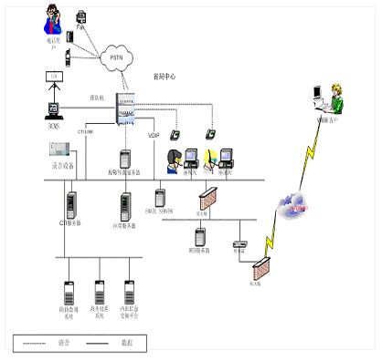 2 ) CTI(計(jì)算機(jī)電話集成)服務(wù)器:通過(guò)該平臺(tái)實(shí)現(xiàn)計(jì)算機(jī)網(wǎng)絡(luò)與電話系統(tǒng)的無(wú)縫結(jié)合,可通過(guò)計(jì)算機(jī)應(yīng)用系統(tǒng)對(duì)話務(wù)處理進(jìn)行操作;