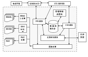 客戶服務(wù)中心系統(tǒng)由智能排隊機(jī)(含接入服務(wù)器)、核心服務(wù)器CTI、交互式語音應(yīng)答系統(tǒng)IVR、語音傳真服務(wù)器、業(yè)務(wù)服務(wù)器、工作流服務(wù)器、數(shù)據(jù)庫服務(wù)器、Internet/Intranet服務(wù)器、人工座席、尋呼機(jī)接口、手機(jī)短消息接口等組成。