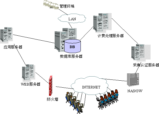 根據(jù)以上體系結(jié)構,寬帶IP城域網(wǎng)計費與業(yè)務管理系統(tǒng)的運行平臺結(jié)構如圖所示: