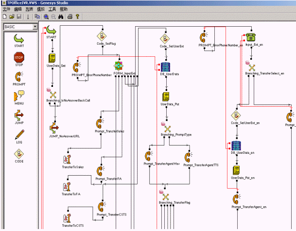 GVP提供了界面友好的功能強大的語音應用開發(fā)工具-Genesys Studio,其中預定了豐富的控件,用來實現菜單語音播報、DTMF收集以及對數據庫查詢等諸多功能。通過拖放的方式就可以快速的隨心所欲地設計出你所需要的語音邏輯應用流程,最終編譯產生用于發(fā)布的ASP或者JSP頁面。應用之間可以彼此調用,提高了語音應用的靈活性和可重用性。Genesys Studio還提供了靈活實用的調試工具,可以隨意設置斷點實時跟蹤流程的執(zhí)行情況,極大的方便了語音應用流程的調試。