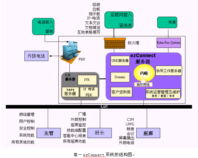 ezConnect系統(tǒng)是由訊泰信息科技公司的北京研發(fā)中心設計開發(fā)出來的一個成熟的多媒體呼叫中心產(chǎn)品。支持傳統(tǒng)電話、web、電子郵件、傳真、語音郵件、IP電話、短消息、WAP等用戶接入方式;對客戶請求采用基于座席技能的智能分派;提供文本交談、白板共享、協(xié)同填表、文檔推送、IP電話、短消息發(fā)送等多種實時交流工具;有非常實用的實時監(jiān)控和報表子系統(tǒng)。核心部分的設計采用分離分層的思想,實現(xiàn)了相對于PBX、IVR、CRM的透明性。系統(tǒng)的配置非常靈活,可以在很短的時間內(nèi)完全改變整個客戶端的風格,或支持一種新的語言。整個系統(tǒng)建立在Java平臺上,具有良好的可移植性。下面是ezConnect系統(tǒng)的結構圖: