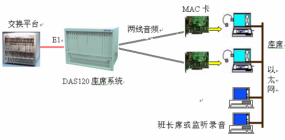 DAS120與億景座席卡MAC配合使用,可使系統(tǒng)的優(yōu)越性發(fā)揮到最大。MAC卡提供的強(qiáng)大功能(收發(fā)DTMF和450HZ信號音,語音錄放等)有效地簡化系統(tǒng)軟件的設(shè)計(jì),并可降低系統(tǒng)成本,如EXCEL交換平臺可不用配置DSP卡,IVR可簡化等。還可以有效地降低交換平臺的處理負(fù)荷,提高話務(wù)處理能力。