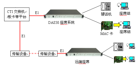 見下圖:DAS30通過1個E1接口與交換機/板卡直接連接,無需配置數(shù)據(jù),可方便地實現(xiàn)本地座席接入或遠端分布式接入(需配合傳輸設(shè)備)。終端可為普通電話機或MAC座席電話卡。