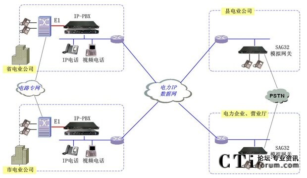 根據(jù)電網(wǎng)公司電話交換系統(tǒng)現(xiàn)狀,結合現(xiàn)在仍未納入程控電話交換網(wǎng)的電力企業(yè)和縣電業(yè)公司的實際情況,遵循經(jīng)濟、實用、可靠、可擴展性的四原則,提出VoIP通信系統(tǒng)融入電話程控交換系統(tǒng)的解決方案。