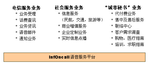 InfOnCall語音服務(wù)平臺應(yīng)用于電信服務(wù)業(yè),能為運營商提供相當(dāng)廣的業(yè)務(wù)范圍。
