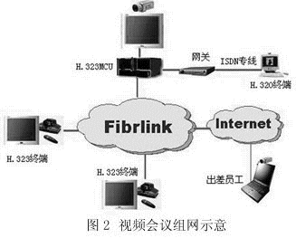 目前視頻會(huì)議系統(tǒng)主要有兩大類(lèi):一種基于H.320協(xié)議標(biāo)準(zhǔn),另一種基于H.323協(xié)議標(biāo)準(zhǔn)。H.320會(huì)議系統(tǒng)技術(shù)成熟,運(yùn)行穩(wěn)定,圖像質(zhì)量高,但業(yè)務(wù)功能單一,組網(wǎng)不夠靈活;H.323會(huì)議系統(tǒng)是最近兩年興起的視頻會(huì)議系統(tǒng),運(yùn)行在廣泛存在的IP網(wǎng)絡(luò)之上,以功能豐富、組網(wǎng)方便靈活等為主要特征,成為視頻會(huì)議系統(tǒng)的發(fā)展方向,但其視頻質(zhì)量很大程度上依賴(lài)于所承載的IP網(wǎng)絡(luò)的質(zhì)量。中電飛華公司基于FibrLINK平臺(tái),為用戶提供H.320、H.323以及H.320和H.323混合組網(wǎng)的視頻會(huì)議系統(tǒng)建設(shè),如圖2所示。