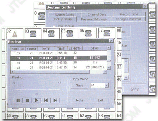 每個(gè)電話通道都有自動(dòng)增益(AGC)功能,可解決長(zhǎng)途電話、國(guó)際電話、或偏遠(yuǎn)地區(qū)電話信號(hào)不良等問(wèn)題。采用數(shù)字化錄音有效避免了傳統(tǒng)磁帶式錄音易失真、難保存的缺點(diǎn)。先進(jìn)的錄音系統(tǒng)設(shè)計(jì),使通話雙方覺察不到正在錄音或監(jiān)聽。 錄音文件為.VOC格式,同時(shí)也可隨意的向前、向后的移動(dòng)。 |
