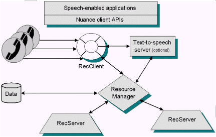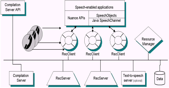 在特定配置下,呼叫控制和提示回放由Nuance系統(tǒng)外的組件控制,RecClient也可用于偷聽模式。最后,RecClient將音頻傳給識別服務(wù)器(RecServer),并將事件和結(jié)果回傳給應(yīng)用程序。