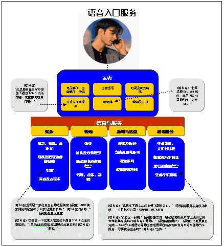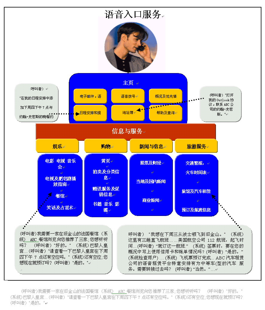 語(yǔ)音網(wǎng)最吸引人之處就在于它可以在一次通話(huà)中,同時(shí)處理多個(gè)任務(wù)。下圖表明一名商務(wù)人員是如何安排好與一個(gè)未來(lái)的商務(wù)旅行有關(guān)的一系列任務(wù)的。他獲取了對(duì)自己有用的信息,順利達(dá)成了一項(xiàng)語(yǔ)音商務(wù)交易,接收個(gè)人信息和辦公室的幫助,并撥打電話(huà)所有這些都是在一個(gè)同步過(guò)程中完成的。
