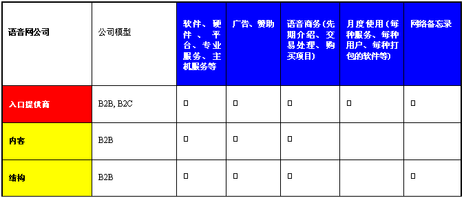 結(jié)構(gòu)公司-技術(shù)軟件提供商(語(yǔ)音識(shí)別、位置標(biāo)識(shí))、主機(jī)公司和服務(wù)站、網(wǎng)絡(luò)發(fā)展商(網(wǎng)絡(luò)應(yīng)用程序服務(wù)器、網(wǎng)絡(luò)整合工具)、軟件和平臺(tái)提供商和躉售網(wǎng)絡(luò)傳輸提供商。這些公司將與語(yǔ)音入口提供商建立公司對(duì)公司的關(guān)系。