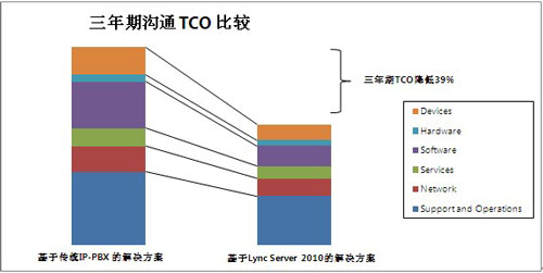 圖:基于IP-PBX的解決方案與基于Lync Server的解決方案的三年期TCO