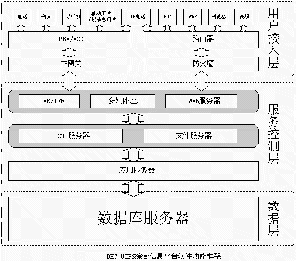 即DHC-UIPS綜合信息平臺的接入端,包括IVR流程、人工坐席等,它是用戶進(jìn)入多媒體客服中心客服系統(tǒng)的入口,它將直接面對用戶并收集各種信息。支持電話、傳真、電子郵件、WEB訪問、WAP、PDA、IP電話、網(wǎng)絡(luò)電話、視頻電話等多種方式接入。