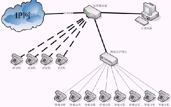 1、 最典型的IP話吧的聯(lián)接方式是寬帶線路連接寬帶路由器,計(jì)費(fèi)電腦和模擬語音網(wǎng)關(guān)連接寬帶路由器,普通話機(jī)連接模擬語音網(wǎng)關(guān),通過計(jì)費(fèi)電腦可以控制模擬語音網(wǎng)關(guān)上的各個(gè)話路,其操作包括開機(jī)、停機(jī)、計(jì)費(fèi)和統(tǒng)計(jì)話費(fèi)等。