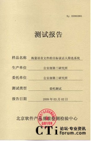 CTI論壇(ctiforum)06月25日消息: 2009年3月02-10日:北京軟件產(chǎn)品質(zhì)量檢測(cè)檢驗(yàn)中心對(duì)《海量語(yǔ)音文件的目標(biāo)說(shuō)話人篩選系統(tǒng)》進(jìn)行了全面測(cè)試包括用戶文檔、功能性、可靠性、易用性、可維護(hù)性等多個(gè)特性。測(cè)試結(jié)果表明《海量語(yǔ)音文件的目標(biāo)說(shuō)話 2009年3月02-10日,北京軟件產(chǎn)品質(zhì)量檢測(cè)檢驗(yàn)中心對(duì)《海量語(yǔ)音文件的目標(biāo)說(shuō)話人篩選系統(tǒng)》進(jìn)行了全面人篩選系統(tǒng)》滿足軟件相關(guān)國(guó)家標(biāo)準(zhǔn)中的要求,系統(tǒng)在模擬測(cè)試環(huán)境中運(yùn)行正常、穩(wěn)定,正式通過北京軟件產(chǎn)品質(zhì)量檢測(cè)檢驗(yàn)中心的嚴(yán)格測(cè)試,系統(tǒng)的漏識(shí)率和誤警率分別達(dá)到了2.81%和 2.81%。