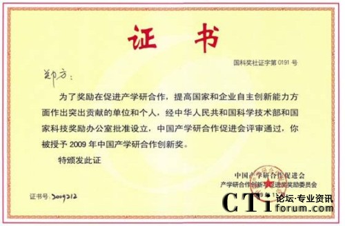 CTI論壇(ctiforum)11月26日消息(記者 潘婷):2009年11月7日,得意公司董事長鄭方博士獲中國產(chǎn)學研合作促進會2009年度中國產(chǎn)學研合作創(chuàng)新獎。該獎勵是面向國內在促進產(chǎn)學研合作及創(chuàng)新方面做出突出貢獻的單位及個人所頒發(fā)的年度榮譽獎。