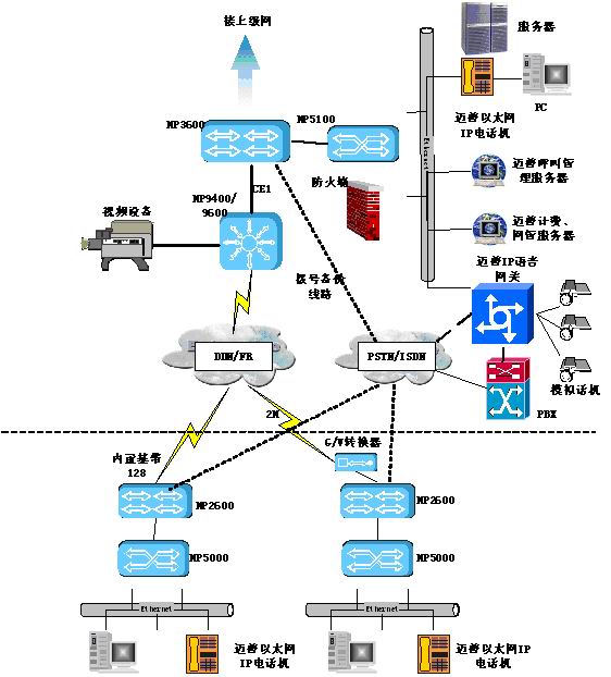 目前許多公安系統(tǒng)雖然采用具有IP語(yǔ)音功能的路由設(shè)備組建網(wǎng)絡(luò),但在業(yè)務(wù)語(yǔ)音交流通常還通過(guò)PBX集團(tuán)交換機(jī)走電信PSTN/ISDN電話網(wǎng),這樣無(wú)法節(jié)省電話費(fèi)用,反而增加了辦公費(fèi)用。邁普IP語(yǔ)音解決方案采用了邁普MyPower VG2000IP語(yǔ)音網(wǎng)關(guān)和邁普以太網(wǎng)IP電話進(jìn)行改造。在整個(gè)網(wǎng)點(diǎn)語(yǔ)音終端全部設(shè)備選用經(jīng)濟(jì)型邁普以太網(wǎng)IP電話機(jī),它采用雙以太口設(shè)計(jì),使網(wǎng)絡(luò)無(wú)需重新布線,同時(shí)也可使用已有的路由器上IP語(yǔ)音模塊;邁普以太網(wǎng)IP電話機(jī)之間的話音通信通過(guò)邁普呼叫管理服務(wù)器集中控制。在主體IP網(wǎng)絡(luò)中,邁普IP語(yǔ)音網(wǎng)關(guān)放置于中心機(jī)房作為傳統(tǒng)PSTN的出口,可以通過(guò)VOS接口、E1接口(中國(guó)一號(hào)信令)、E&M接口等多種方式接入公安PBX,將PSTN線路傳來(lái)的時(shí)分話音或傳真信息進(jìn)行分組和壓縮,轉(zhuǎn)換成IP數(shù)據(jù)包,通過(guò)路由設(shè)備路由到目的地;在沒(méi)有PBX的公安機(jī)房,邁普IP語(yǔ)音網(wǎng)關(guān)可以提供32路的模擬用戶接口,可以完全替代傳統(tǒng)PBX并接入PSTN,并提供額外功能,如圖中虛線所示;整個(gè)方案還可以針對(duì)公安用戶特殊需求"定做"特色功能,例如緊急告警等方便日常辦公。