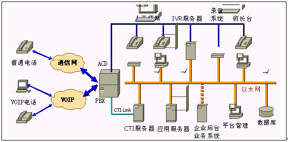 ·CTI服務(wù)器:將電話交換系統(tǒng)和計(jì)算機(jī)系統(tǒng)有機(jī)地結(jié)合起來