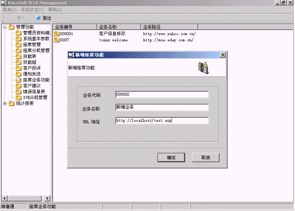 當(dāng)人工座席登陸后,XCCP Agent從系統(tǒng)數(shù)據(jù)庫加載業(yè)務(wù)菜單,每個(gè)業(yè)務(wù)菜單都對(duì)應(yīng)一個(gè)URL,當(dāng)話務(wù)員點(diǎn)擊業(yè)務(wù)菜單時(shí),系統(tǒng)就訪問對(duì)應(yīng)的URL,效果顯示在座席瀏覽器上;系統(tǒng)同時(shí)將呼叫信息或從其他座席和IVR得到的UUI信息傳送給相應(yīng)的頁面,有頁面對(duì)這些信息自行處理;菜單和URL的對(duì)應(yīng)關(guān)系由XCCP Management進(jìn)行配置;如果業(yè)務(wù)系統(tǒng)本身就是瀏覽器模式的,這樣的結(jié)構(gòu)可以將這些終端界面直接嵌入座席系統(tǒng)中,無需進(jìn)行二次開發(fā)和進(jìn)行接口定義。下面是配置界面: