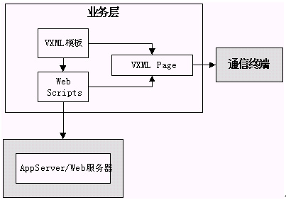 用于存放和產(chǎn)生VoiceXML腳本文檔,可以是一個(gè)文件系統(tǒng)或WEB服務(wù)器,一般文件系統(tǒng)應(yīng)用于靜態(tài)腳本,WEB服務(wù)器應(yīng)用于動(dòng)態(tài)腳本;存放應(yīng)用邏輯組件或中間件,通過對(duì)后臺(tái)業(yè)務(wù)系統(tǒng)訪問,動(dòng)態(tài)產(chǎn)生VoiceXML頁面,進(jìn)行事務(wù)處理