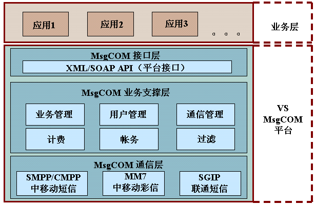 - 業(yè)務(wù)層:運(yùn)行在VS MsgCOM的各類業(yè)務(wù)應(yīng)用。