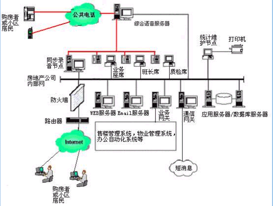 。。用戶(hù)利用電話(huà)、傳真、WEB、手機(jī)短信息、電子郵件等撥打某一特服號(hào)碼(如95xxx)進(jìn)入房地產(chǎn)多媒體客戶(hù)服務(wù)中心系統(tǒng),本系統(tǒng)依托房地產(chǎn)企業(yè)各類(lèi)業(yè)務(wù)技術(shù)支持系統(tǒng),通過(guò)人工受理或自動(dòng)語(yǔ)音服務(wù)等方式為各類(lèi)客戶(hù)提供購(gòu)房和物業(yè)管理服務(wù);形成了對(duì)外服務(wù)于客戶(hù),對(duì)內(nèi)管理、分析、決策系統(tǒng)相結(jié)合的呼叫中心。