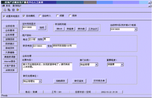 。。接通呼叫中心的電話(huà)后,按語(yǔ)音提示選擇相應(yīng)的服務(wù),選擇相應(yīng)的服務(wù)功能鍵后,在服務(wù)人員的計(jì)算機(jī)屏幕上自動(dòng)彈出對(duì)話(huà)框顯示用戶(hù)的詳細(xì)信息。