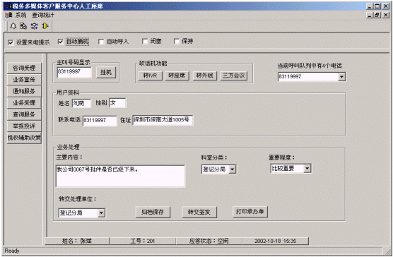 9、可實現(xiàn)座席間轉(zhuǎn)移時,話路、客戶數(shù)據(jù)、整個操作界面(包括動態(tài)輸入的數(shù)據(jù))同步轉(zhuǎn)移。